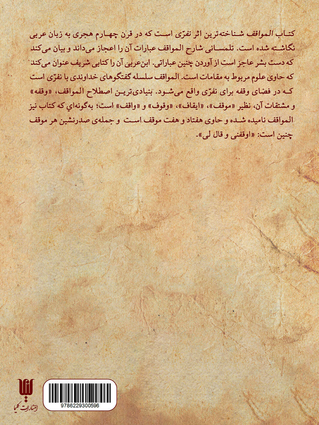 کتاب المواقف شناخته‌ترین اثر نفّری است که در قرن چهارم هجری به زبان عربی نگاشته شده است. تلمسانی شارح المواقف عبارات آن را اعجاز می‌داند و بیان می‌کند که دست بشر عاجز است از آوردن چنین عباراتی. ابن‌عربی آن را کتابی شریف عنوان می‌کند که حاوی علوم مربوط به مقامات است. المواقف سلسله گفتگوهای خداوندی با نفّری است که در فضای وقفه برای نفّری واقع می‌شود. بنیادی‌ترین اصطلاح المواقف، «وقفه» و مشتقات آن، نظیر «موقف»، «ایقاف»، «وقوف» و «واقف» است؛ به‌گونه‌ای که کتاب نیز المواقف نامیده شده و حاوی هفتاد و هفت موقف است و جمله‌ی صدرنشین هر موقف چنین است: «اوقفنی و قال لی».