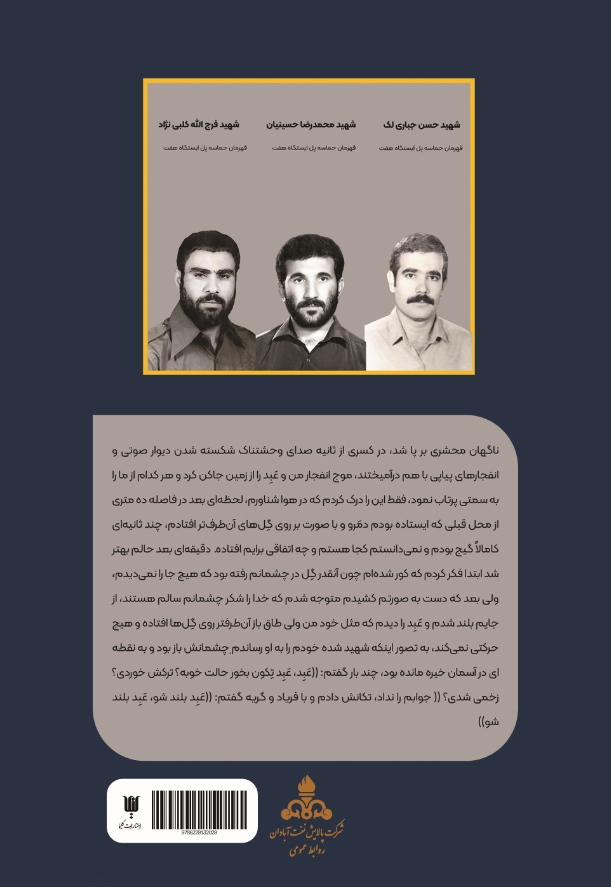 دقیقهای بعد حالم بهتر شد. ابتدا فکر کردم که کور شدهام چون آنقدر گِل در چشمانم رفته بود که هیچ جا را نمیدیدم، ولی بعد که دست به صورتم کشیدم متوجه شدم که خدا را شکر چشمانم سالم هستند. از جایم بلند شدم و عَبِد را دیدم که مثل خود من ولی طاقباز آنطرفتر روی گِلها افتاده و هیچ حرکتی نمیکند، به تصور اینکه شهید شده خودم را به او رساندم چشمانش باز بود و به نقطهای در آسمان خیره مانده بود، چند بار گفتم: « عَبِد، عَبِد تِکون بخور حالت خوبه؟ ترکش خوردی؟ زخمی شدی؟»
